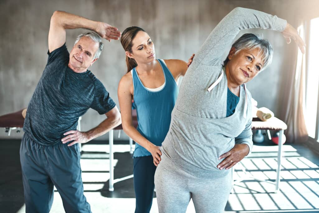 Senior couple exercise stretching and exercising with dumbbell lifting weigth at home health care